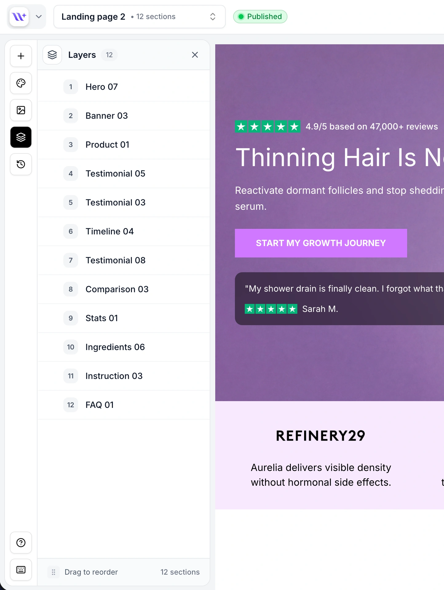 The layers panel provides a compact, list-based view of every section on your page. It is an alternative to working directly on the canvas and is especially useful for pages with many sections where scrolling through the full canvas would be slow.