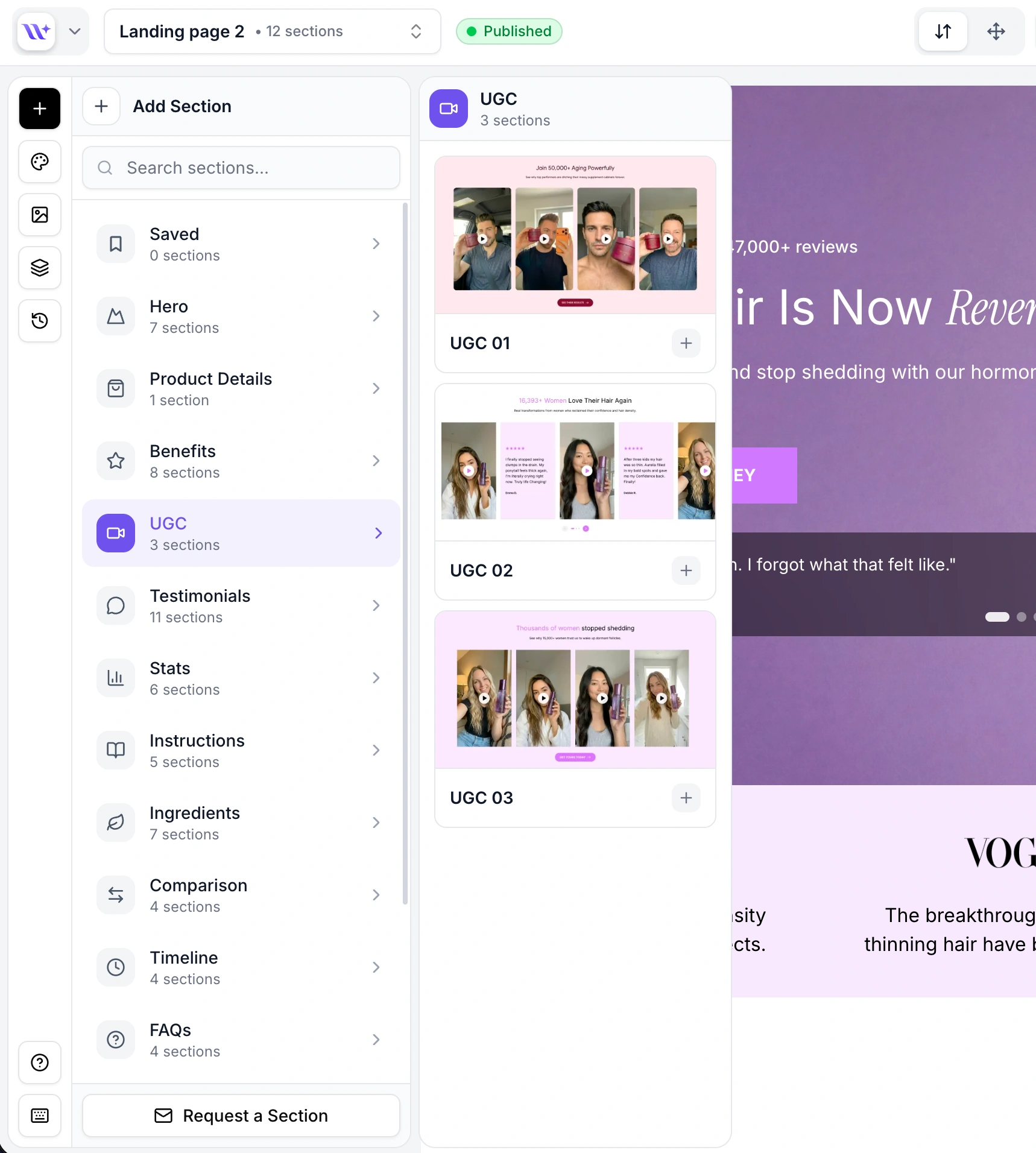 Sections are the building blocks of every EcomWize page. Each section is a self-contained, fully designed content block that you place on your canvas to build your landing page. EcomWize offers 70+ pre-built sections across 14 categories, so you can assemble a complete page in minutes.