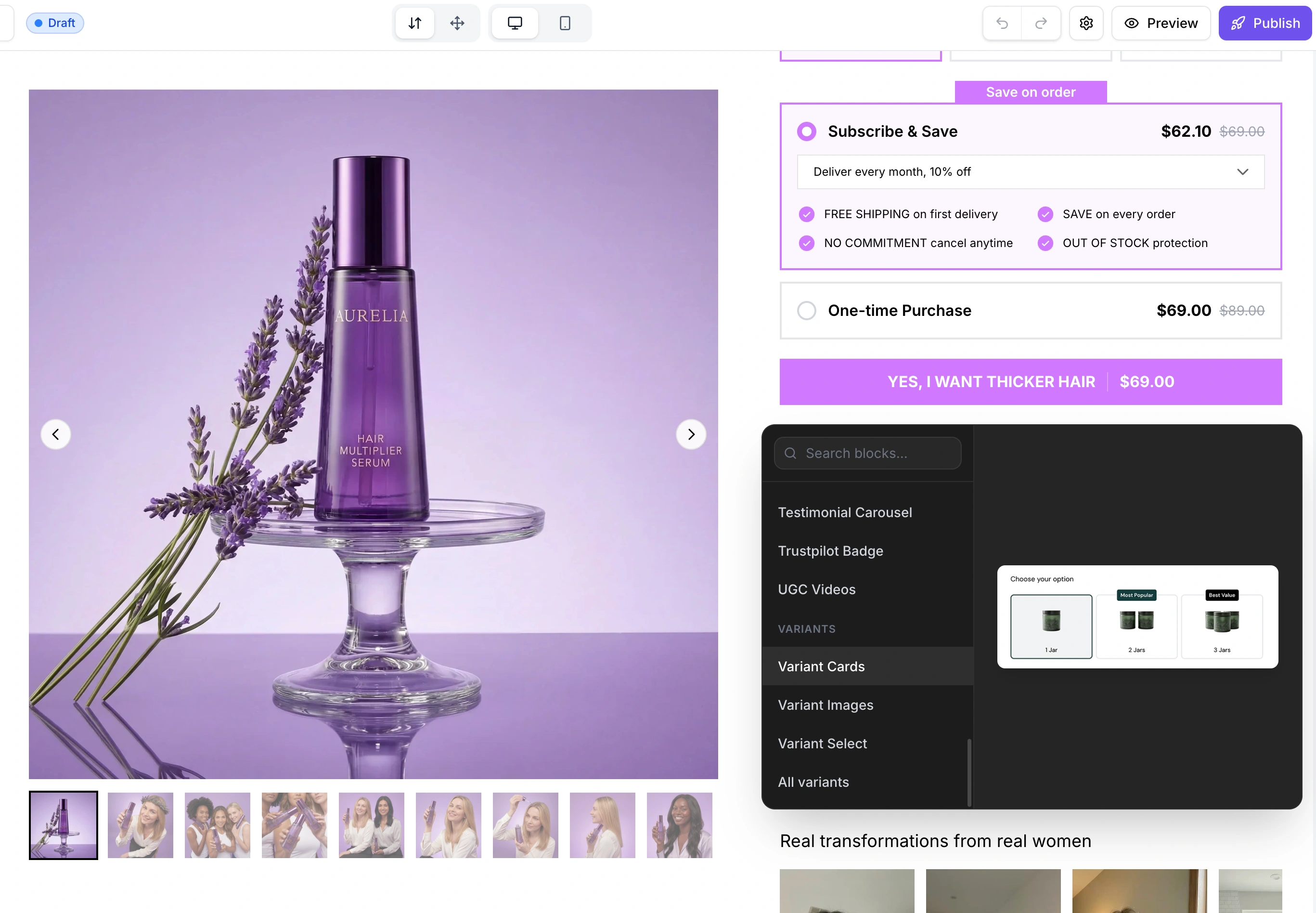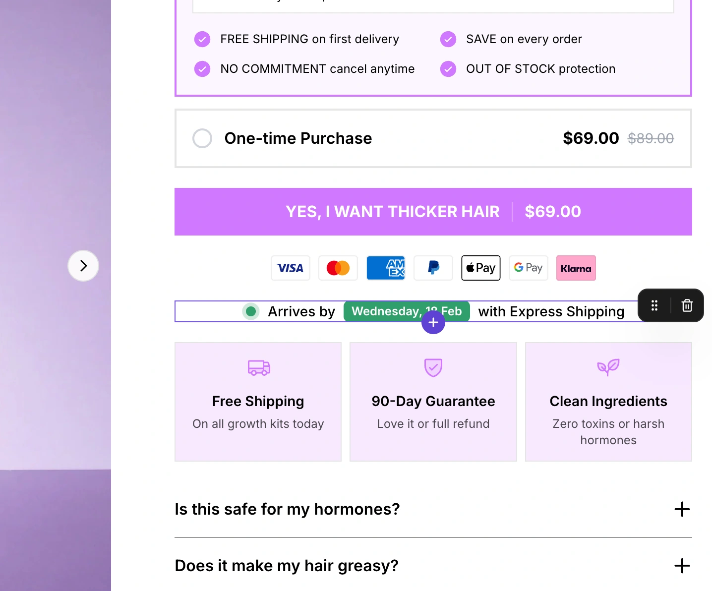 Once added, drag snippets within the product section to rearrange their order. The order you set in the builder is the order they appear on the published page.