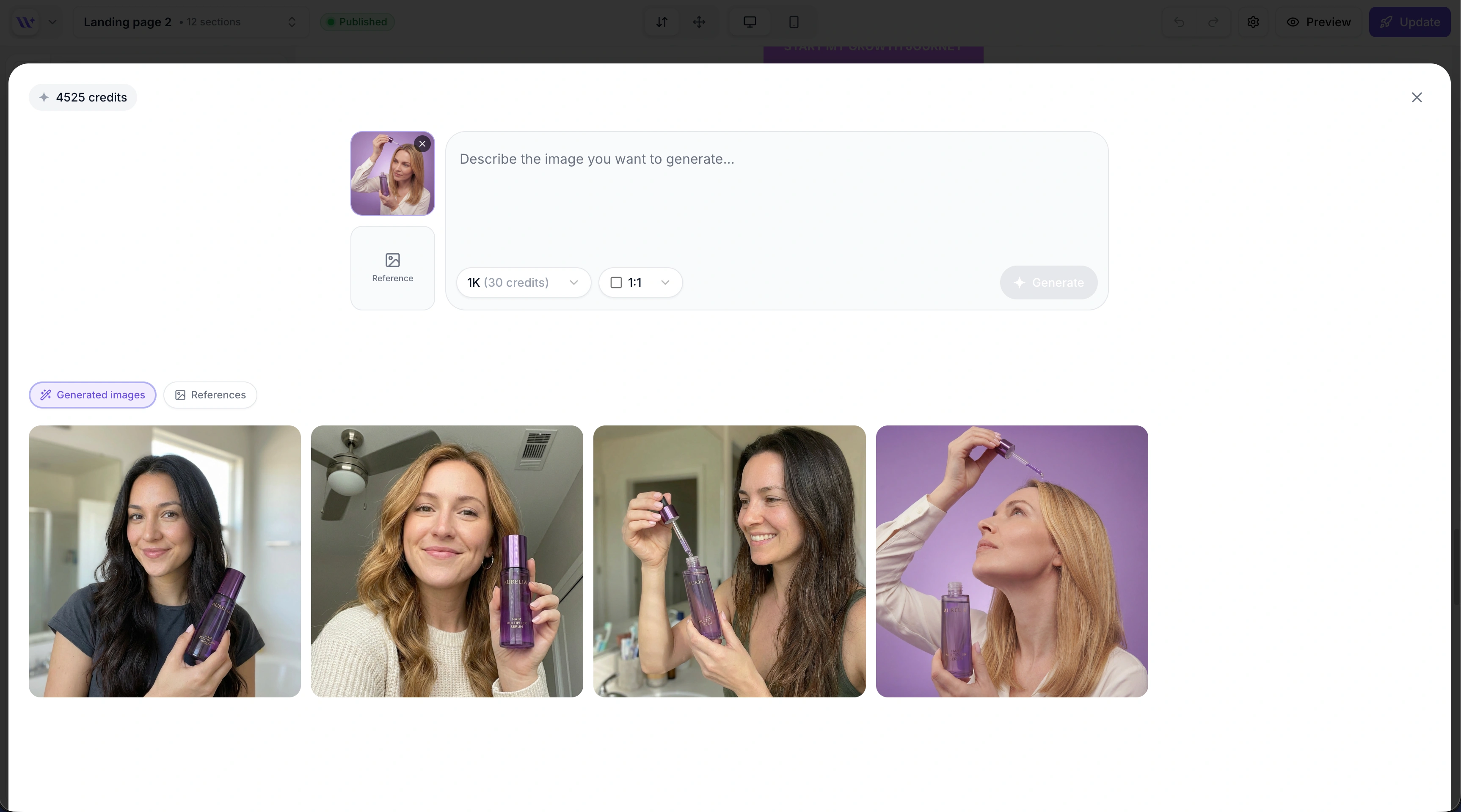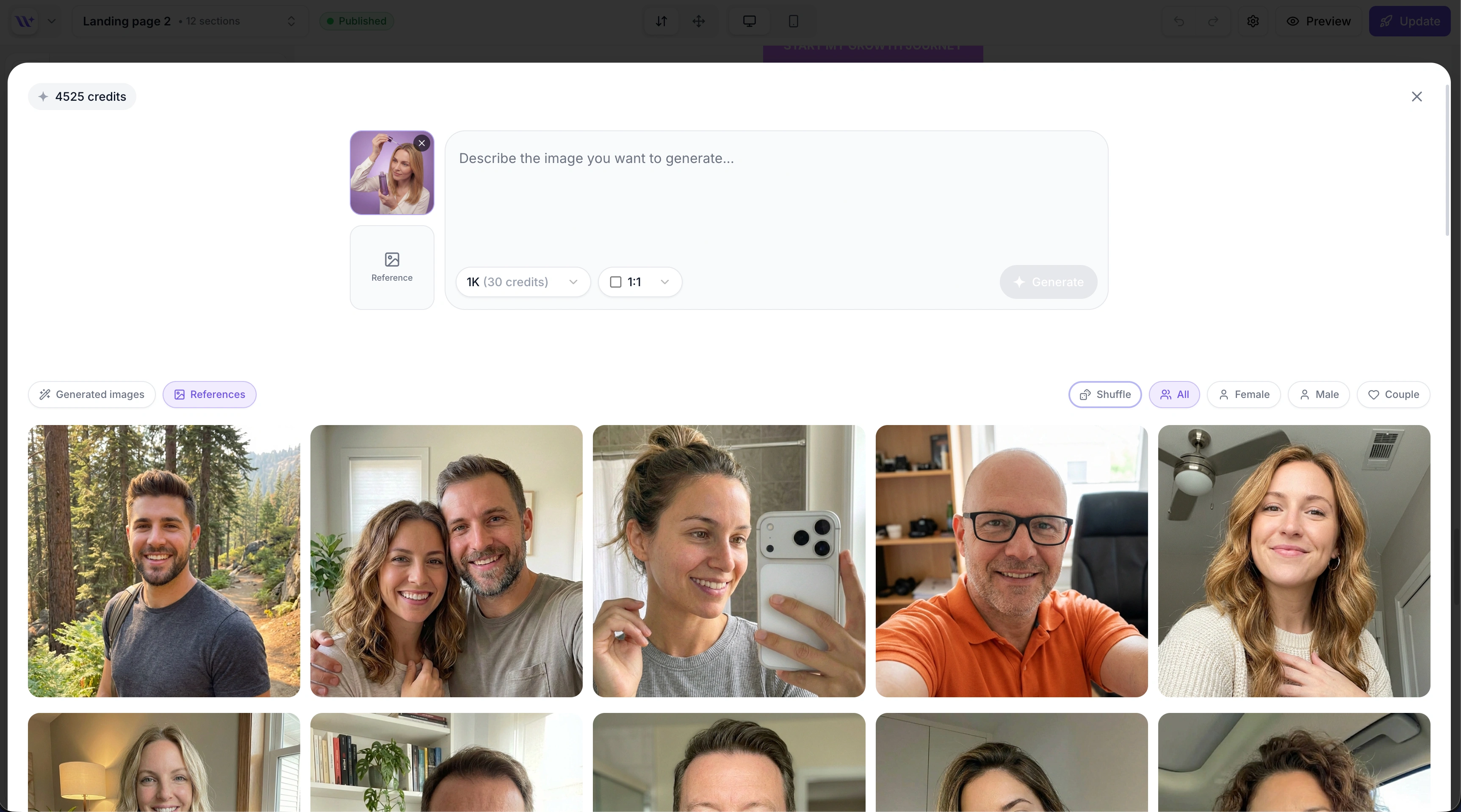 EcomWize Builder includes AI-powered image generation that lets you create custom visuals directly within the builder. Generate images from text descriptions, transform existing images with style references, and choose from a library of pre-generated avatars.