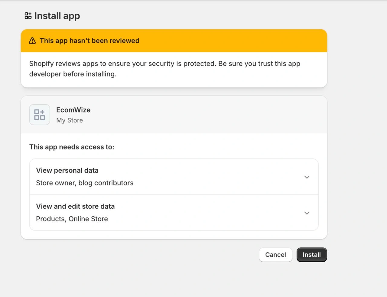 You will be redirected to Shopify to authorize the app. After approving, you will be redirected back to EcomWize with your store connected.