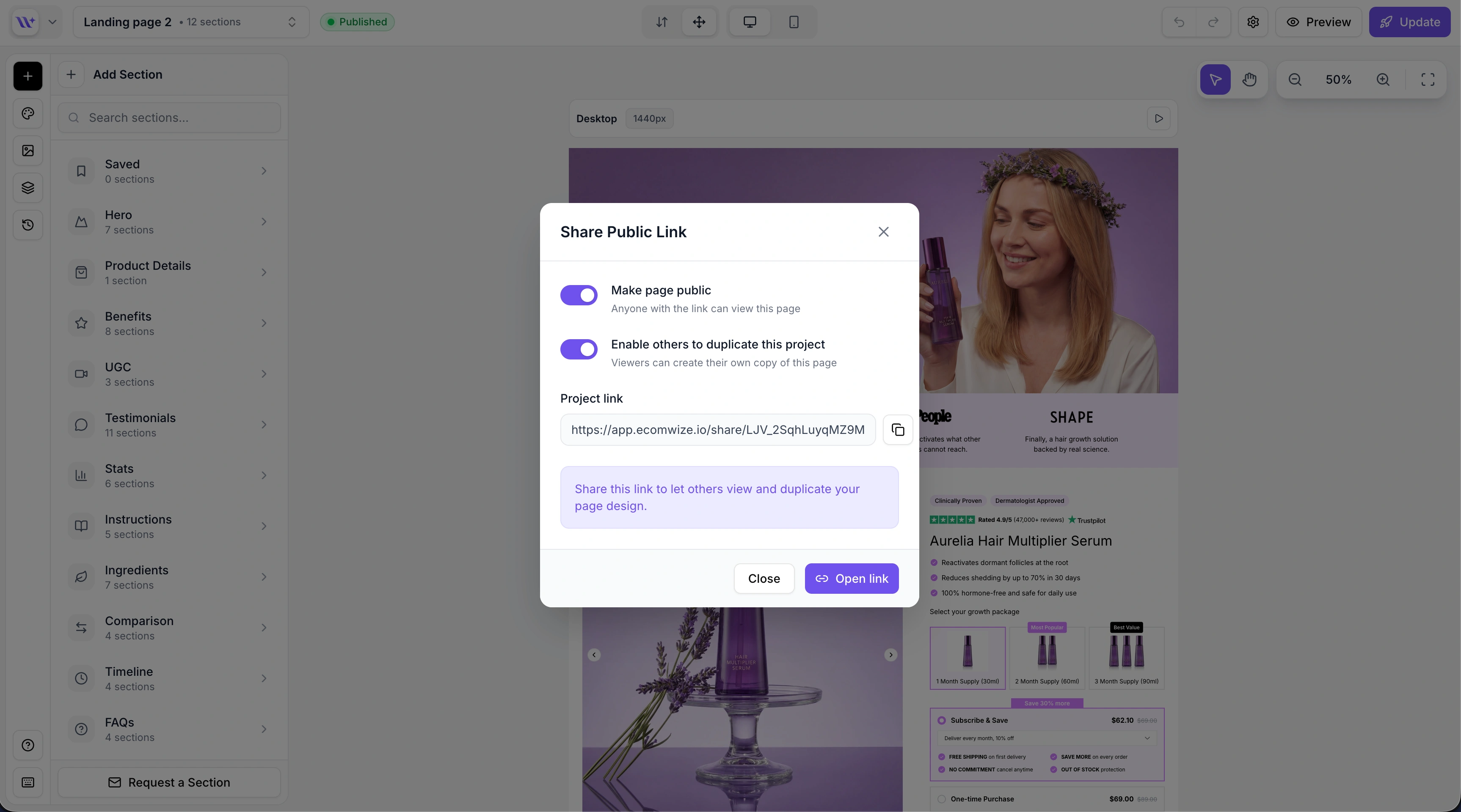 When sharing is enabled, an additional option appears: Enable others to duplicate this project. Toggling this on allows viewers to create their own copy of your page in their EcomWize account.