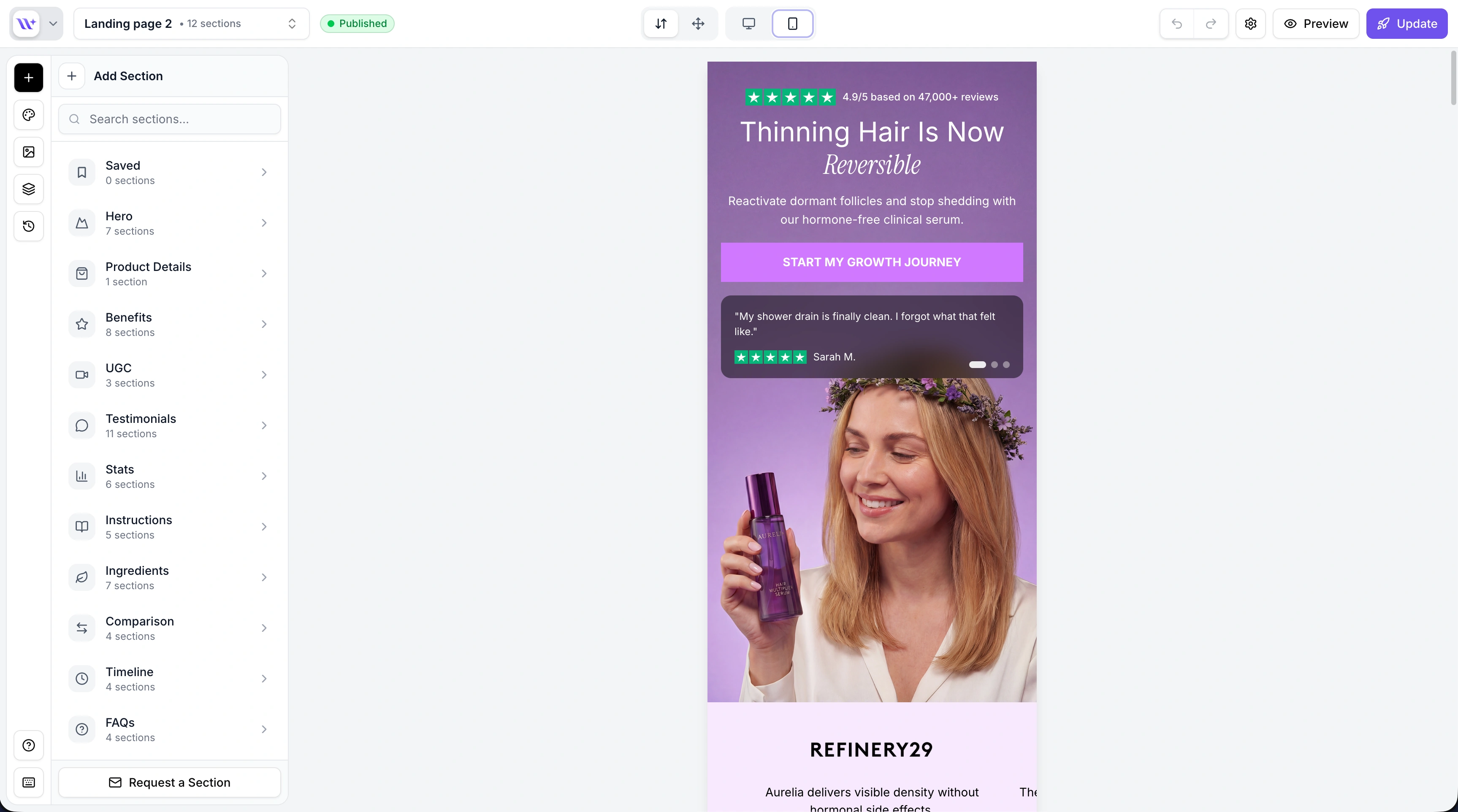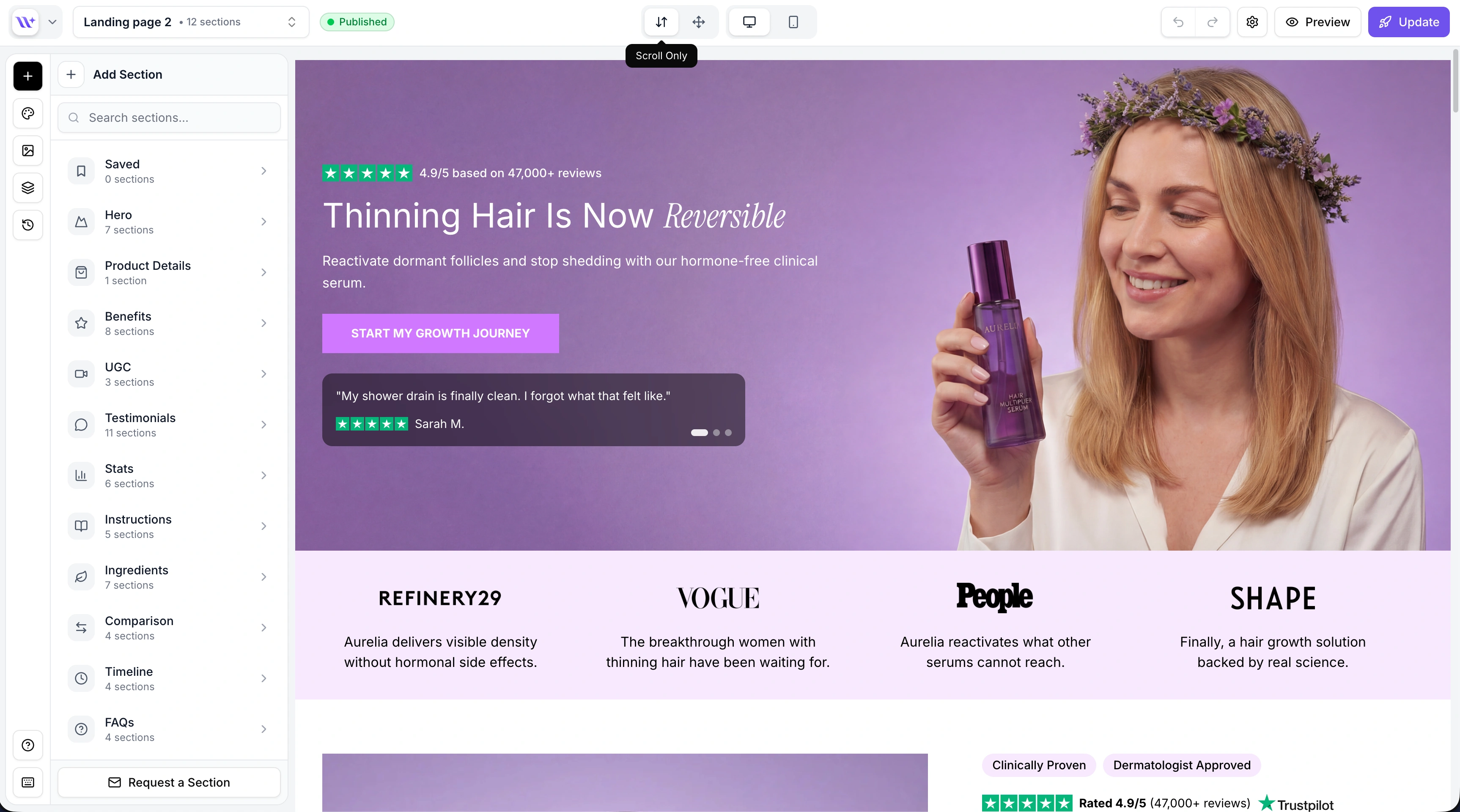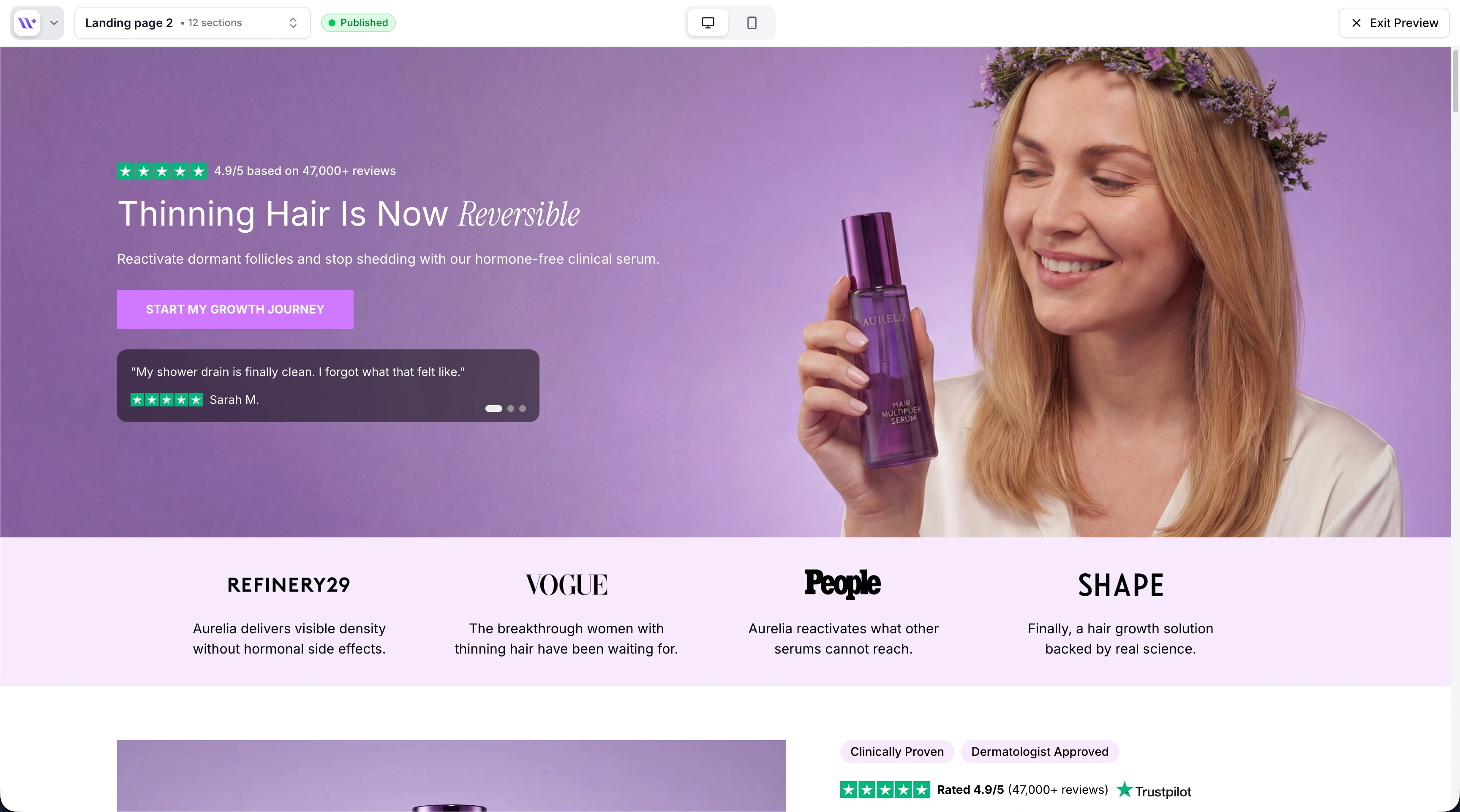 Preview mode hides all editing UI - section borders, toolbars, drag handles, and the sidebar - so you can see your page exactly as your visitors will.